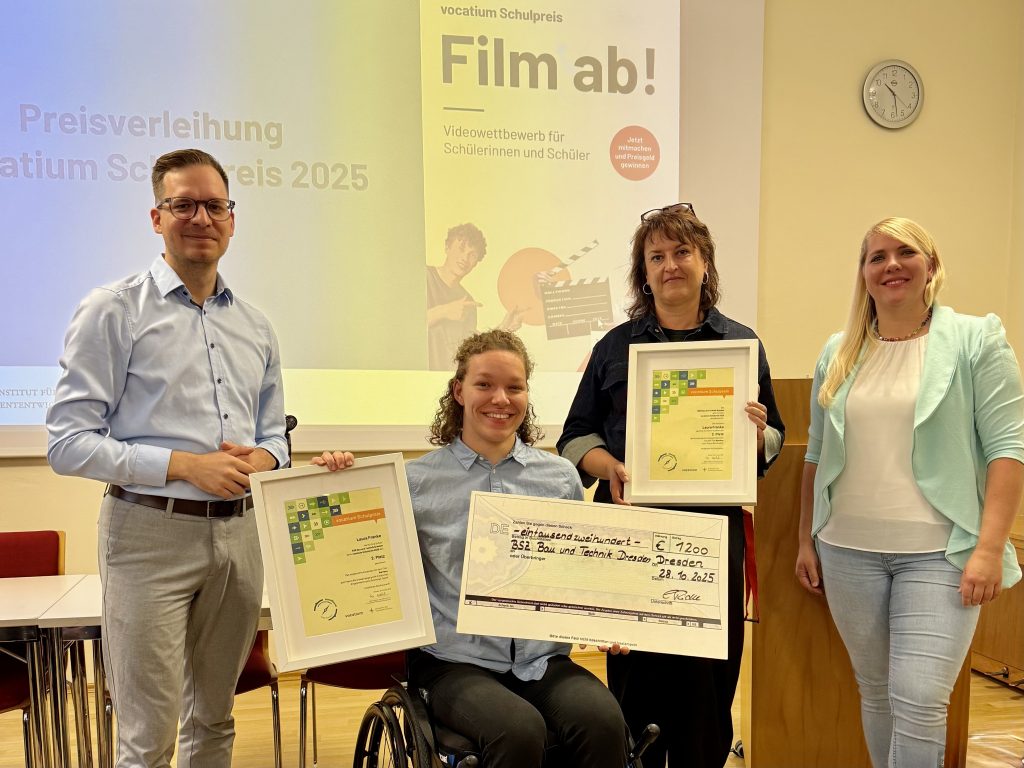 Zum dritten Mal in Folge ist der vocatium Schulpreis durch das Institut für Talententwicklung (IfT) vergeben worden. Der bundesweite Wettbewerb richtete sich an Schulen und stand 2025 unter dem Thema „Berufsorientierung/ Berufswahl“. Über 100 Teilnehmerinnen und Teilnehmer reichten dazu ihre Videobeiträge ein. Auch Laura Franke aus unserer Fachoberschule für Gestaltung drehte einen Film mit dem Titel „Barriere“, welcher sich mit der – in vielen Bereichen des öffentlichen Lebens noch nicht vorhandenen – Barrierefreiheit für Menschen mit Behinderungen beschäftigt. Laura ist selbst Betroffene und erlebt derartige Einschränkungen auch bei der Berufswahl. Sie beschreibt im Film die Motivation für ihre Entscheidung, ein Studium der Inklusion zu beginnen.