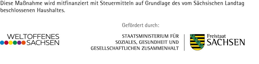 Die Projekttage wurden im Rahmen der Förderrichtlinie »Weltoffenes Sachsen« durch die Sächsische Aufbaubank (SAB) unterstützt. Ziel dieser Förderung ist es, demokratische Kultur zu stärken und Vorurteile sowie gruppenbezogene Menschenfeindlichkeit abzubauen.